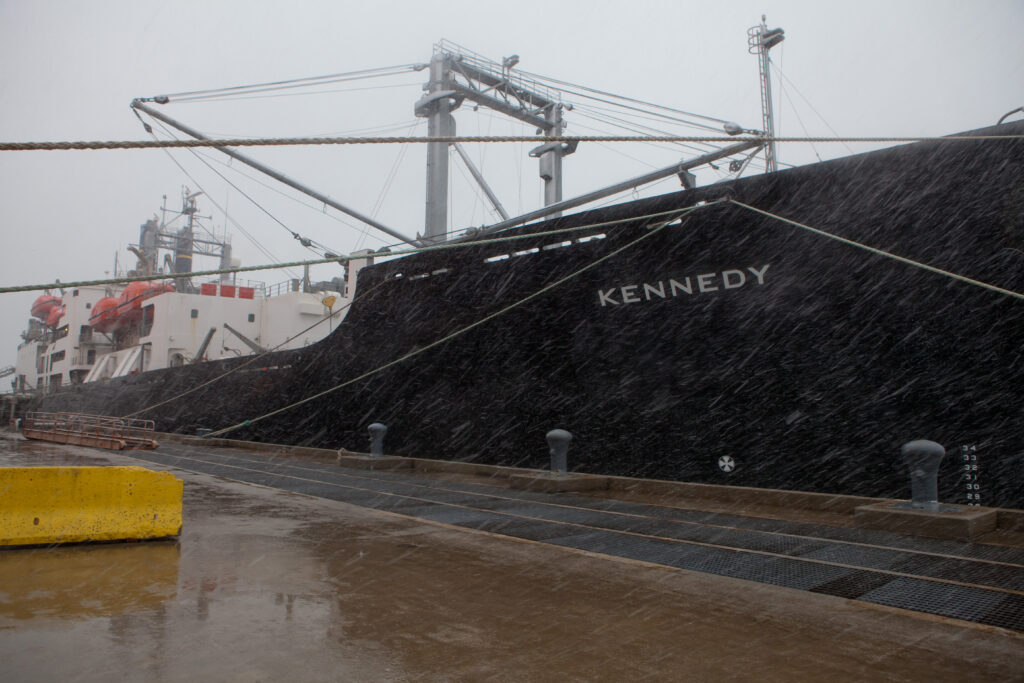 The 171 student cadets onboard are applying classroom learning to real-world environments through daily training in navigation, engineering, maintenance, safety and security while attending classes. Training for marine transportation students includes standing watch to survey the waters and surrounding areas for possible dangers and abnormalities. Cadets William Flores ’24 and Kai Ethridge ’26 spotted the vessel near daybreak during their morning watch.